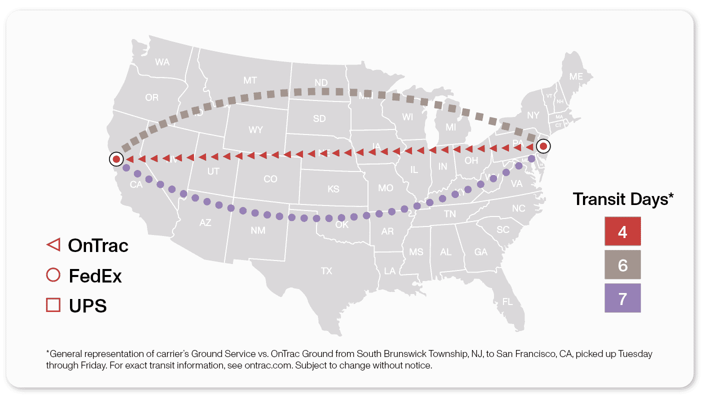 Take the OnTrac Ground fast lane from the Garden State to Golden State (and many places between) without breaking the bank, and stand out from your competitors.